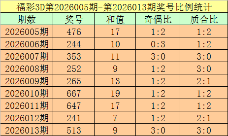 开奖回顾:福彩3D第2026013期:奖号为513,奖号质合比为3:0,大小比为1:2,跨度为4,类型为组六。