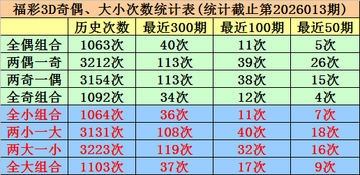奇偶、大小分析:在最近50期开奖中,全偶组合开出5次,当前遗漏7期、两偶一奇组合开出26次,当前遗漏1期、两奇一偶组合开出15次,当前遗漏9期、全奇组合开出4次,当前遗漏0期,本期注意全奇组合;两大一小组合出现16期,当前轮空2期、全大组合出现9期,当前轮空3期、全小组合出现7期,当前轮空1期、两小一大组合出现18期,当前轮空0期,本期看好开出两大一小组合。