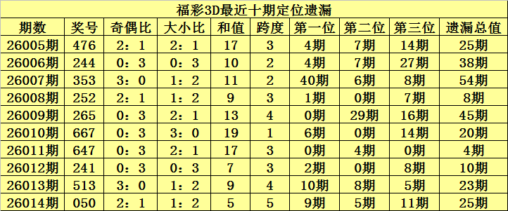 开奖回顾:福彩3D第2026014期奖号:050,百位号码遗漏9期、十位号码遗漏5期、个位号码遗漏11期,遗漏总值为25期。