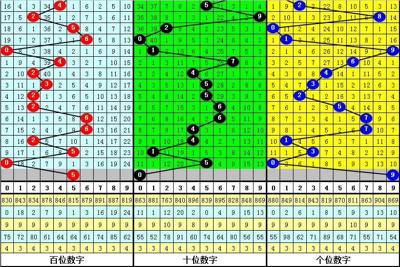 百位分析:该位最近10期开出了4个0路号码、1个1路号码、5个2路号码,2路号码热出,1路号码走冷。本期排除1路号码,参考号码:5。