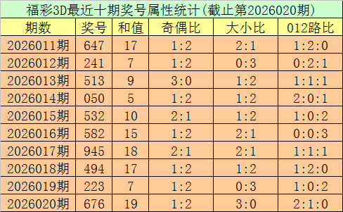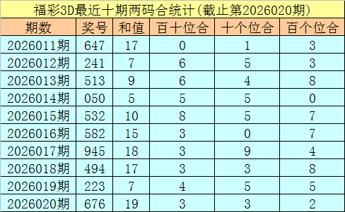 开奖回顾:第2026020期福彩3D奖号为676。奖号形态为组三,大小比为3:0,和值为19,奇偶比为1:2,012路比为2:1:0,跨度为1。