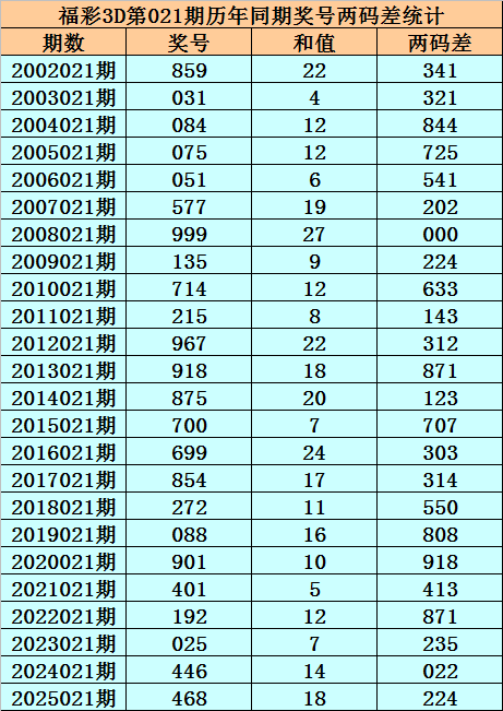 福彩3D第021期,历史上期开出24次奖号,其奖号分别为:859、031、084、075、051、577、999、135、714、215、967、918、875、700、699、854、272、088、901、401、192、025、446、468,奖号两码合差分别开出: