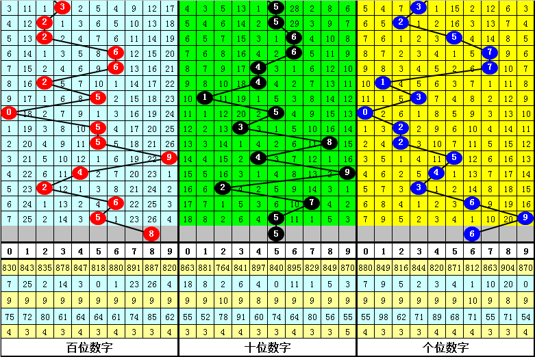 跨度、和值分析:近期跨度主要分布在1-6区域,比较分散,本期看好跨度下降,参考跨度3。和值近期波动范围较大,上期开出和值19,本期防止和值重复开出,参考和值19。