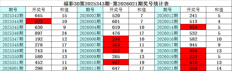 上期回顾:福彩3D第2026021期奖号为:559,其中奖号组选类型为:组三,奇偶比为3:0,大小比为3:0,012路比为1:0:2,和值为19,跨度为4。