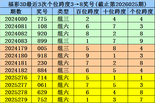 末位跨度分析:前3期末位奖号为4-1-9,最近两期末位奖号跨度为3、8,末位奖号跨度历史上连续两期开出3、8的现象共35次,其最近两次奖号为: