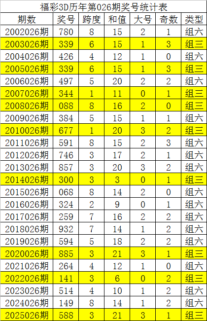 福彩3D历年第026期同期分别开出奖号:780、339、426、339、497、344、088、384、677、591、746、857、300、068、324、259、932、594、885、264、141、514、149、588,详细统计见下表: