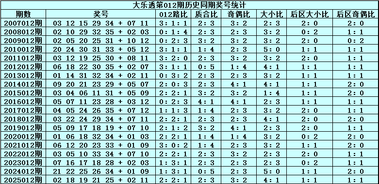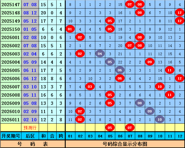 后区号码分析:第012期历史同期开奖中,后区两码全大开出7次,全小开出3次,一大一小开出9次,本期后区预计出现一大一小奖号,参考号码02、05、07、11。