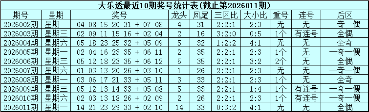 大乐透第2026011期奖号为:14、21、23、29、33+02、10。其中前区三区比为0:3:2,大小比为4:1,没有出现重号,没有出现连号,后区为全偶号码。