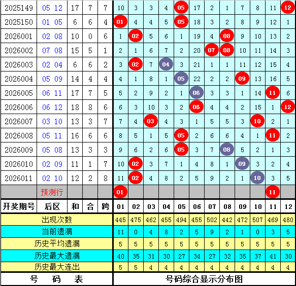 和值跨度:上期和值开出120,对比第2026010期和值上升了58个点位,本期预计和值在大号区域热出,看好出现在111周围。