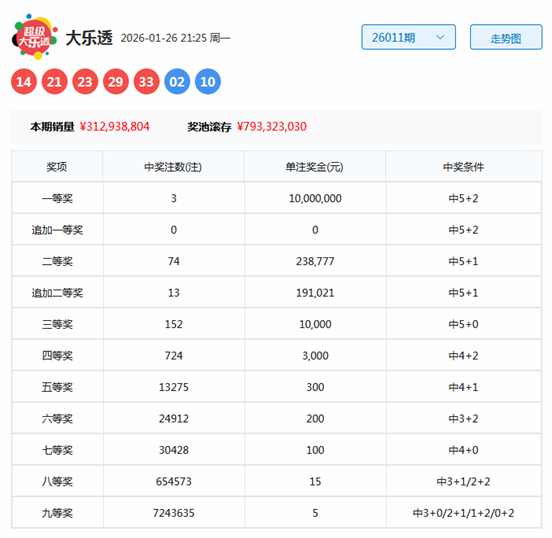 大乐透第2026011期开出奖号为:14、21、23、29、33+02、10。其中前区奇偶比为4:1,三区比为0:3:2,大小比为4:1,后区开出全偶组合。