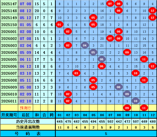 后区第二位推荐:在连续5期开奖中分别出号:10、11、08、09、10,均值为9.6,其中奇数奖号表现较冷,本期适当关注回补,参考奇数号码11。