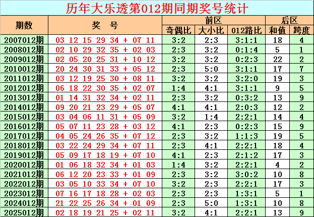 在历史同期奖号中,后区奖号跨度尾数大小比为11:8(定义:跨度1、2、3、10、11为小尾跨度,跨度4、5、6、7、8、9为大尾跨度),其中小尾跨度出现次数较低,本期注意小尾跨度回补,关注跨度10。