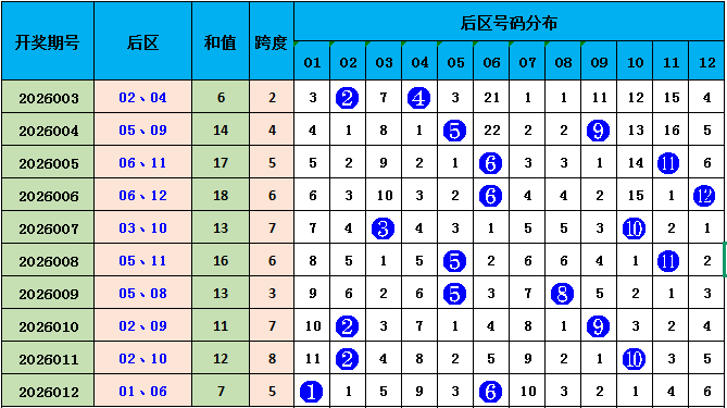 上期后区开出奇偶号码01、06,最近10期奇偶比9:11,偶数球开出次数多,本期推荐奇奇组合01、11。