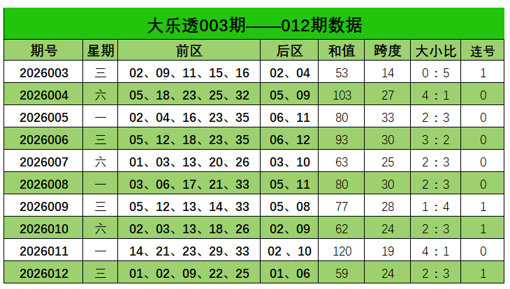 大乐透第2026012期出奖号统计:前区01、02、09、22、25,后区01、06。和值59,跨度24,大小比2:3,开出1组连号。