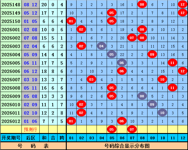后区分析:上期后区开出1路+0路号01和06,最近30期后区奖号012路比为14:17:29,最近10期后区奖号012路比为7:4:9,本期后区注意号码02、03、05、07、12,单挑两码组合05、07。