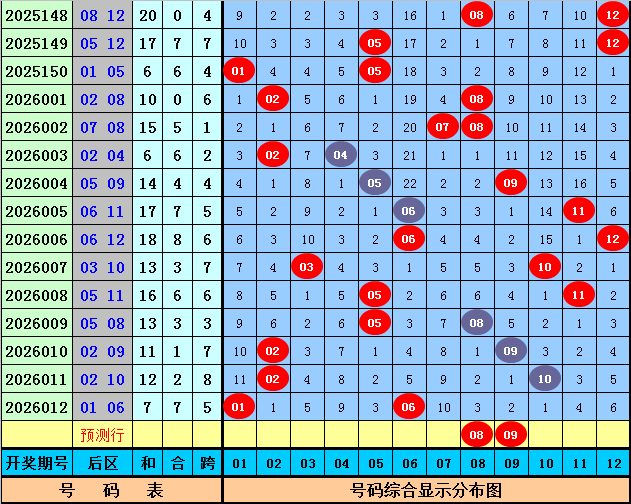 后区分析:上期后区开出号码01和06,最近10期后区奖号奇偶比为9:11,大小比为8:12,本期后区看好号码05、06、08、09、12,后区单挑两码08、09。
