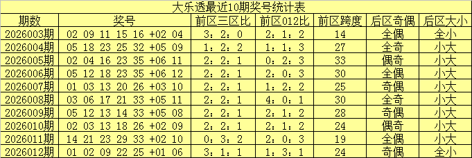 大乐透第2026012期奖号开出:01 02 09 22 25 +01 06。其中前区三区比为3:1:1,012路比为1:3:1,后区开出全小、一奇一偶奖号。