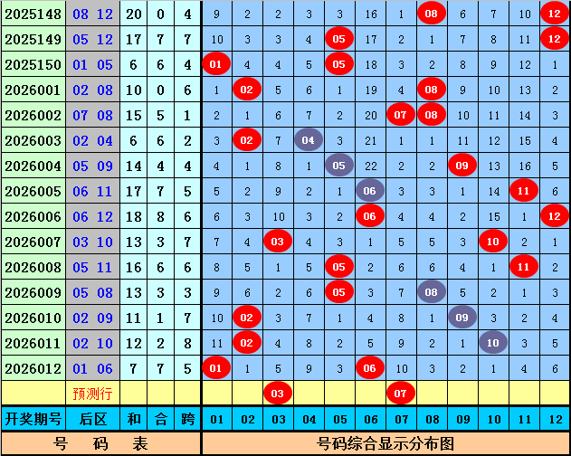后区上期开出奖号01和06,该组合历史上出现了51次,其下期奖号频次分别为:号码09出现16次,03、06、07出现10次,05、10、12出现8次,01、02出现7次,08、11出现6次,04出现4次,本期后区参考号码03、04、07、09,精选两码03和07。
