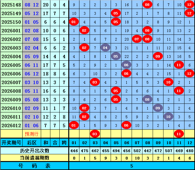 后区分析【一区01-04,二区05-08,三区09-12】:上期后区奖号为01和06,分别落在第一、二区,近50期后区三区比为30:41:29,近10期三区比为6:7:7,本期注意第一、三区号码出现,关注两码03+11。