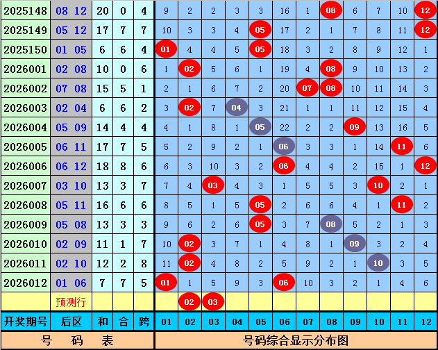 后区分析:后区上期开出号码01和06,分别遗漏11期和5期,目前后区01-12区间冷温热号码个数比为0:5:7,本期后区注意号码02+03。