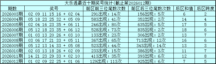 体彩大乐透第26012期奖号开出:01 02 09 22 25+01 06,前区奖号大小比为2:3,012路比为1:3:1,奇偶比为3:2,后区号码和值为7,跨度为5。