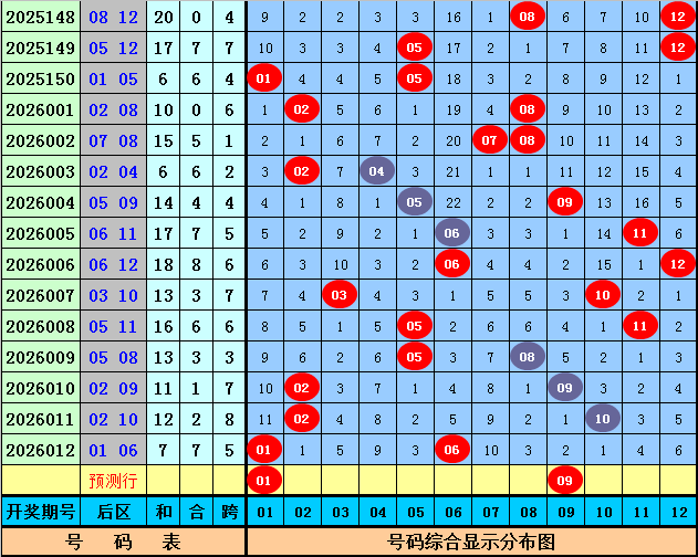 后区号码分析:上期后区开出奖号01 06,和值为7,跨度为5,本期后区参考号码01、02、05、07、09。