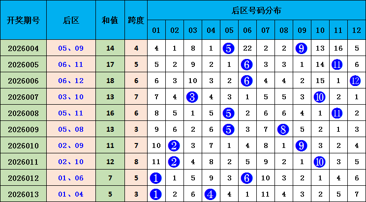 前区第二位:前10期中奇数号码开出4次,偶数号码开出6次,奇偶数偶数热出,本期注意偶数号码出现。参考号码:11。