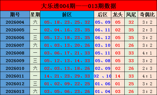 大乐透第2026013期开奖号码:前区03 05 06 23 26,后区01 04。龙头03,凤尾26,奇偶比3:2。