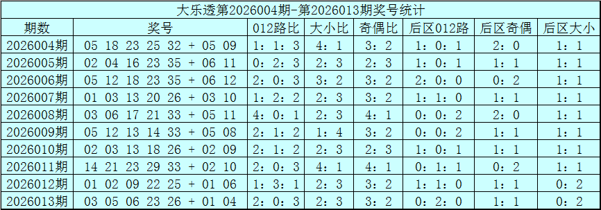 体彩大乐透第26013期奖号为:03 05 06 23 26+01 04,前区奖号012路比为2:0:3,奇偶比为3:2,大小比为2:3,后区为全1路号码。