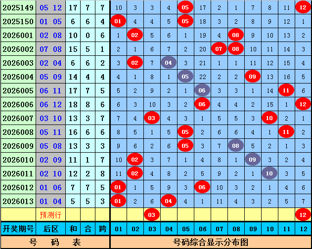 后区分析:上期后区开出号码01和04,最近10期后区奖号奇偶比为10:10,大小比为8:12,本期后区看好号码03、05、08、11、12,后区单挑两码03、12。