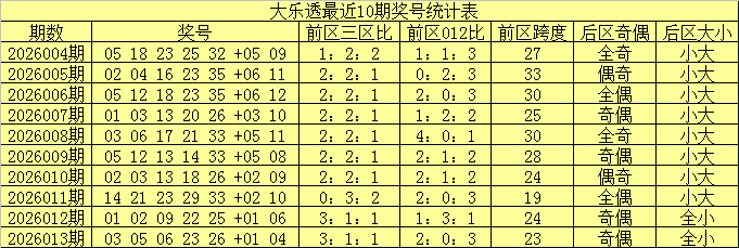 大乐透第2026013期奖号开出:03 05 06 23 26 +01 04。其中前区三区比为3:1:1,012路比为2:0:3,后区开出全小、一奇一偶奖号。