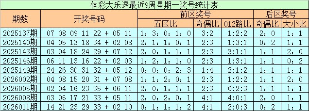 上期回顾:体彩大乐透上周星期一(第2026011期)奖号为14 21 23 29 33 + 02 10,前区奖号五区比为0:1:1:1:2,奇偶比为4:1,012路比为2:0:3,后区奖号奇偶比为0:2,大小比为1:1。