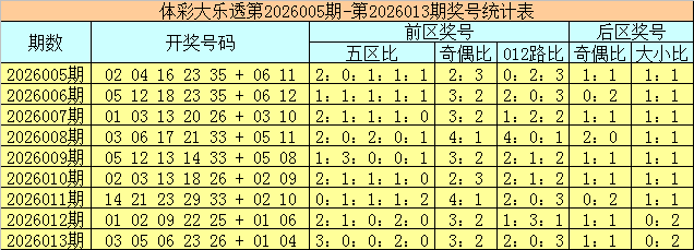 体彩大乐透第2026013期奖号为03 05 06 23 26 + 01 04,前区号码五区比为3:0:0:2:0,奇偶比为3:2,012路比为2:0:3,后区号码奇偶比为1:1,大小比为0:2。