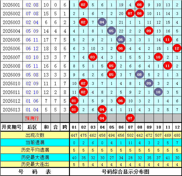 后区判断:上期后区奖号为01和04,开出热码+温码组合。最近十期后区开出8个热码、6个温码和6个冷码,本期预计奖号关注热码+冷码组合,参考两码04、07。