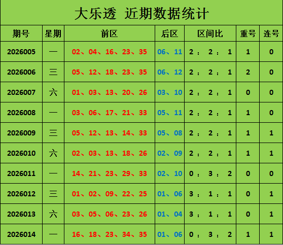 上期后区开出号码01 06,和值7,近十期和值17 18 13 16 13 11 12 7 5 7,和值波动范围较大,本期预测和值会上升,重点关注号码:04 10,和值14。