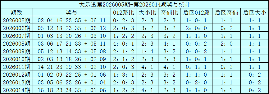 体彩大乐透第26014期奖号为:16 18 23 34 35+01 06,前区奖号012路比为1:2:2,奇偶比为2:3,大小比为4:1,后区2路号码轮空。
