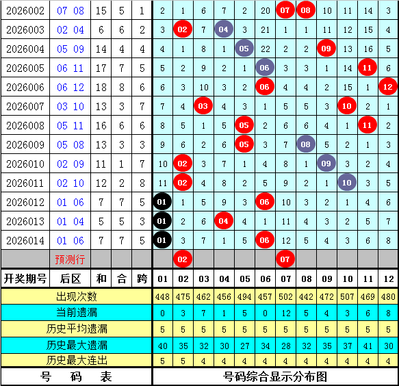 前区温码判断:在大乐透第2026014期开奖之后,前区目前有7个遗漏值4-9之间的温码,温码遗漏分布为:号码13遗漏值为4期、号码12遗漏值为5期、号码17遗漏值为6期、号码20遗漏值为7期、号码04遗漏值为9期。