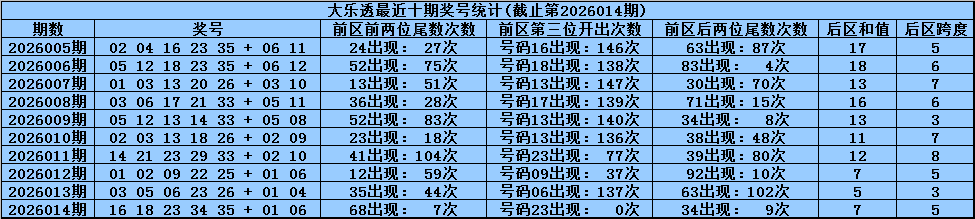 体彩大乐透第2026014期奖号为:16 18 23 34 35+01 06,前区号码大小比开出4:1,012路比开出1:2:2,奇偶比开出2:3,后区号码和值开出7,跨度开出5。