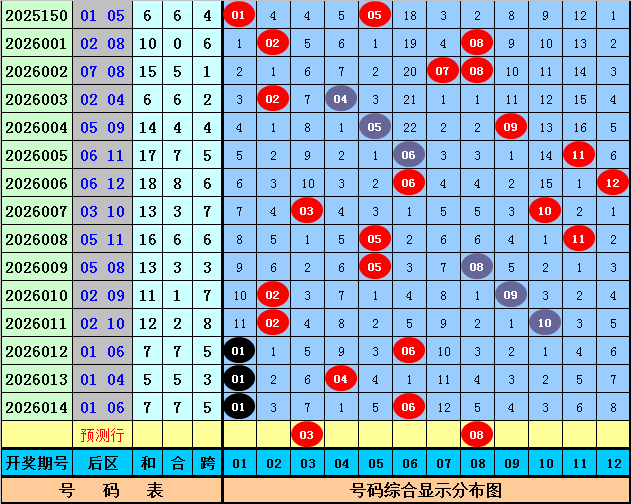 后区分析:上期该位开出奖号01和06,和值为7,跨度为5,后区前4次开出和值7和跨度5时,其下期奖号分别为:07+11、08+12、04+10、01+04,号码奇偶比为3:5,大小比为5:3,012路比为1:5:2,本期后区号码参考03、05、06、08、11,精选两码03、08。