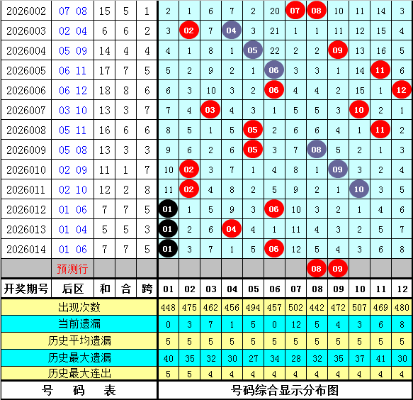 在历史同期开奖中,后区号码和值奇偶为8:11,其中奇号和值出现相对较少,本期适当关注奇号和值回补,参考和值17。