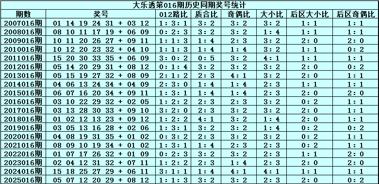 体彩大乐透第2026016期历史同期开奖号码分析: