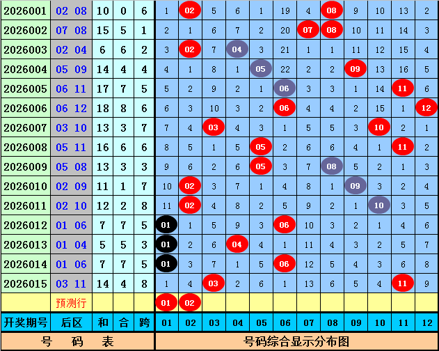 012路分析:上期前区奖号012路比为0:4:1,最近两周2路前区奖号走势较热,0路前区奖号表现较冷。