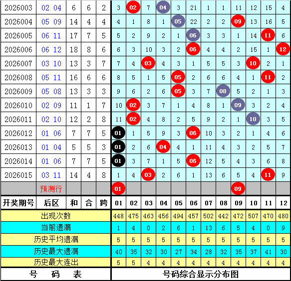 后区判断:上期后区奖号为03和11,开出温码+温码组合。最近十期后区开出9个热码、8个温码和3个冷码,本期预计奖号关注热码+温码组合,参考两码01、09。