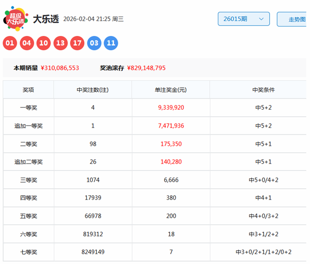 大乐透第2026015期开出奖号为:01、04、10、13、17+03、11。其中前区奇偶比为3:2,三区比为3:2:0,大小比为0:5,后区开出全奇组合。
