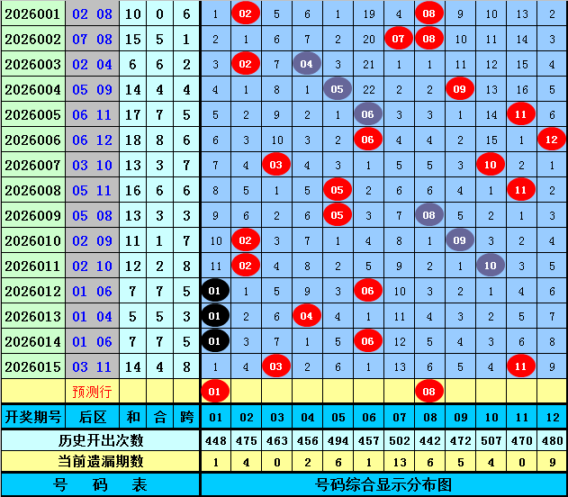 后区分析:上期后区奖号为03和11,最近5期后区和值分别为12、7、5、7、14,后区跨度分布范围在3-8,本期后区注意两码01、08。