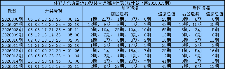 体彩大乐透第2026015期开奖回顾:前区奖号:01、04、10、13、17,后区奖号03、11,前区前各位遗漏:2期、9期、22期、4期、6期,遗漏总值43期,后区各位遗漏7期和6,遗漏总值13期。