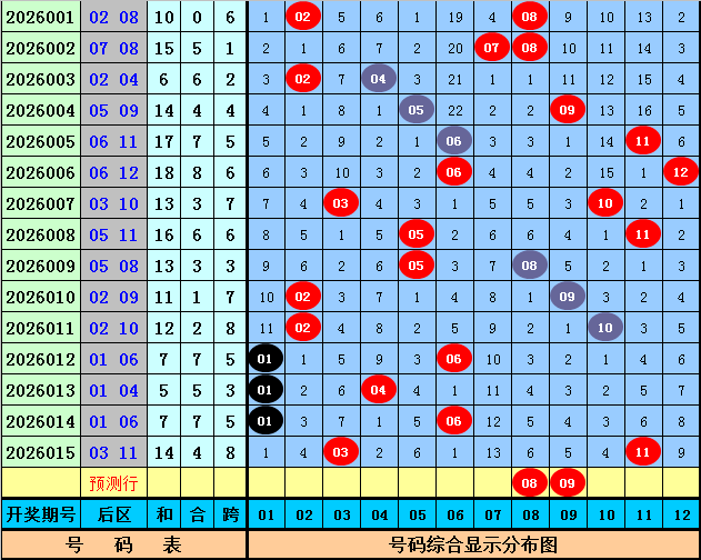 后区奖号分析:上期后区奖号为03+11,遗漏期数为7期和6期,目前后区号码01-12分别遗漏:1期、4期、0期、2期、6期、1期、13期、6期、5期、4期、0期、9期,本期后区注意号码01、06、08、09、11,两码关注08、09。