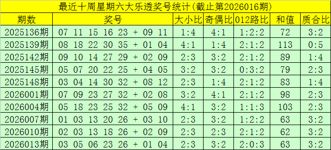 其中,号码奇偶比为11:3,奇数号码走势较热,012路比为5:5:4,各路号码走势相当,质合比为12:2;