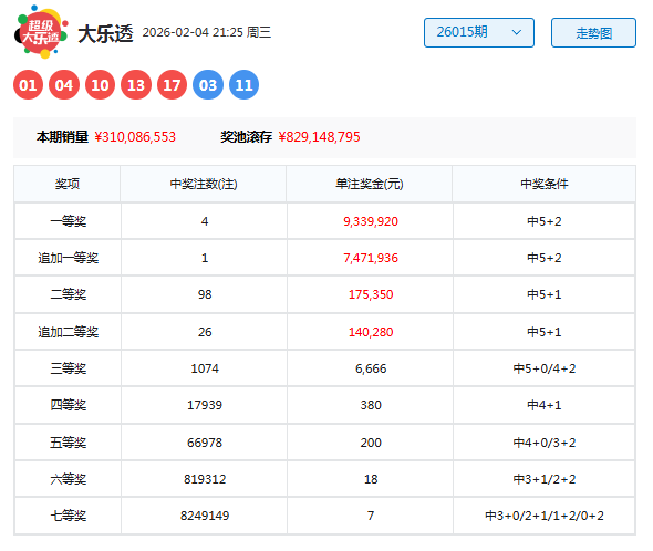 大乐透第26015期开奖。当期开奖号码为:前区01 04 10 13 17,后区03 11。当期前区号码大小比为0:5,奇偶比为3:2,三区比3:2:0;后区开出小大组合03 11