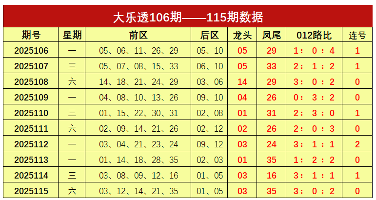 大乐透第2025115期出奖号统计:前区03、12、14、21、35,后区01、05。龙头03,凤尾35,012路比为3:0:2,未开出连号。